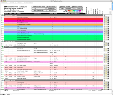 They can see at a glance what meetings are taking place in what rooms at a given venue (like a Hyatt Hotel Conference Center) and what material and personnel are needed at each (like projectors, displays, kiosks, etc. and people to run them).